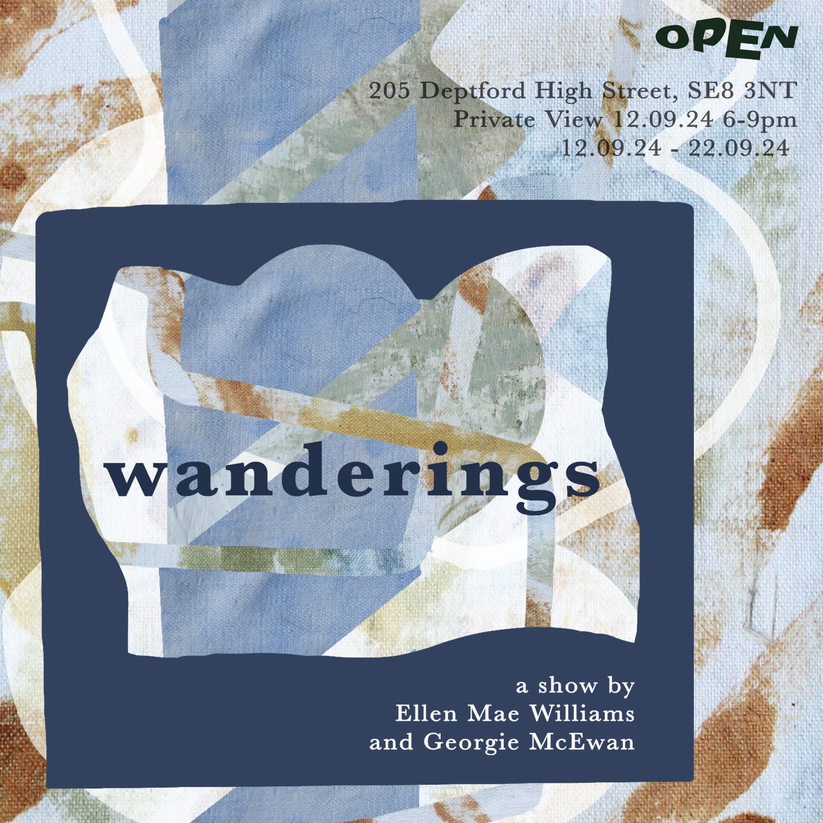 ‘Wanderings’ a duo show by Ellen Mae Williams and Georgie McEwan, opening 12th- 22nd September at Open Gallery, 205 Deptford High Street, SE8 3NT.