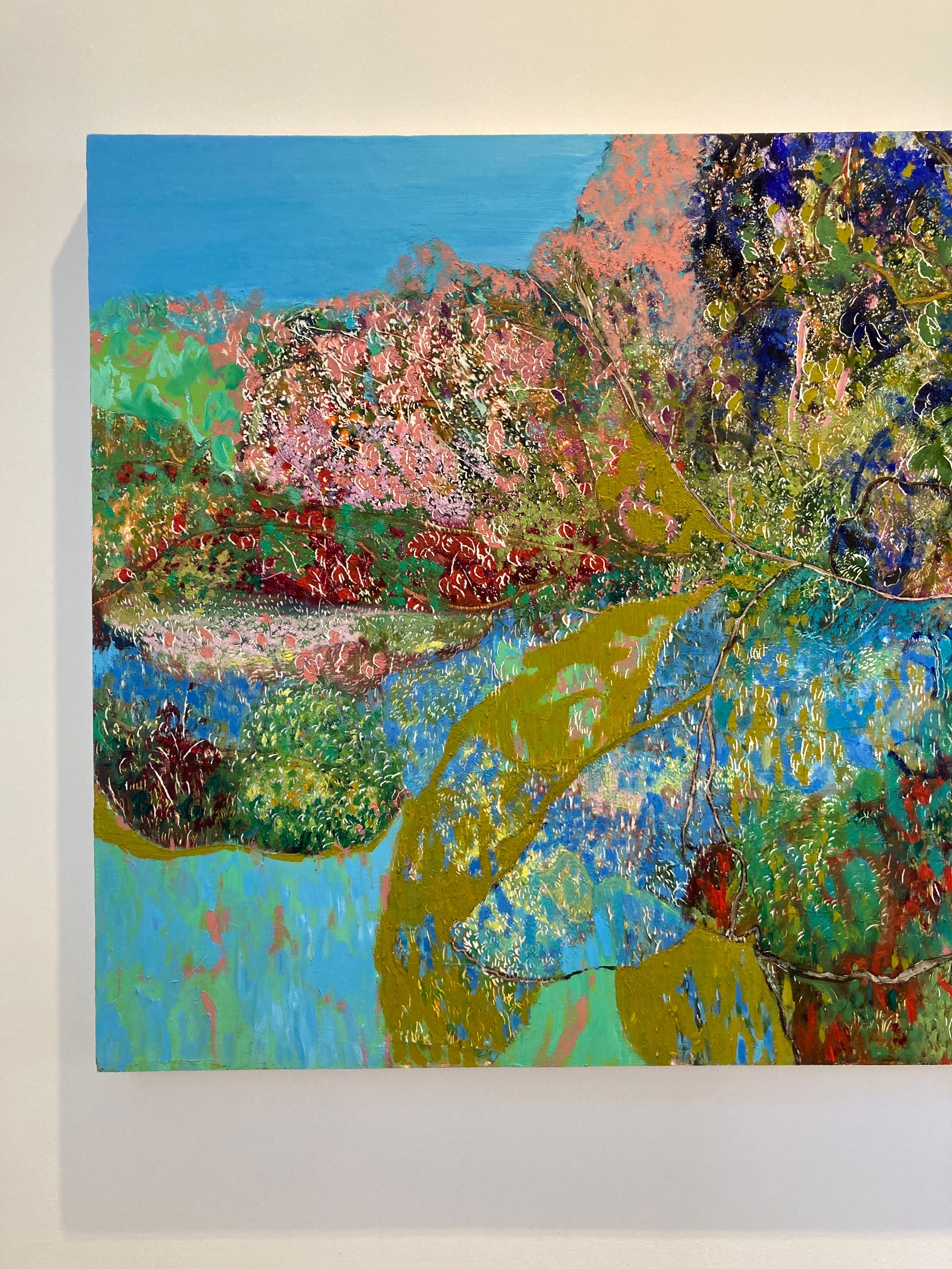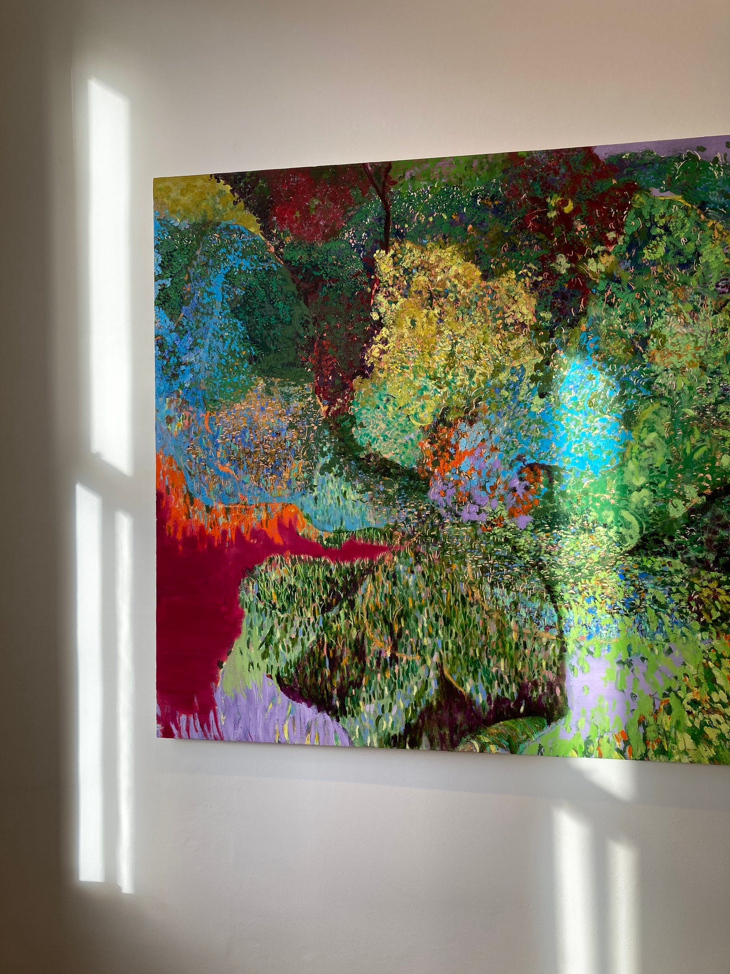 The works draw you into a vibrant utopia, each painting like a scene from the Garden of Eden. Harrison takes the landscape to the right side of abstraction. Balancing blocks of solid colour with intricate marks, the colour palettes sumptuous and rich - like walking from a black and white film into a world of colour, saturation levels at max. I came away feeling nourished, pumped full of serotonin and alive.
