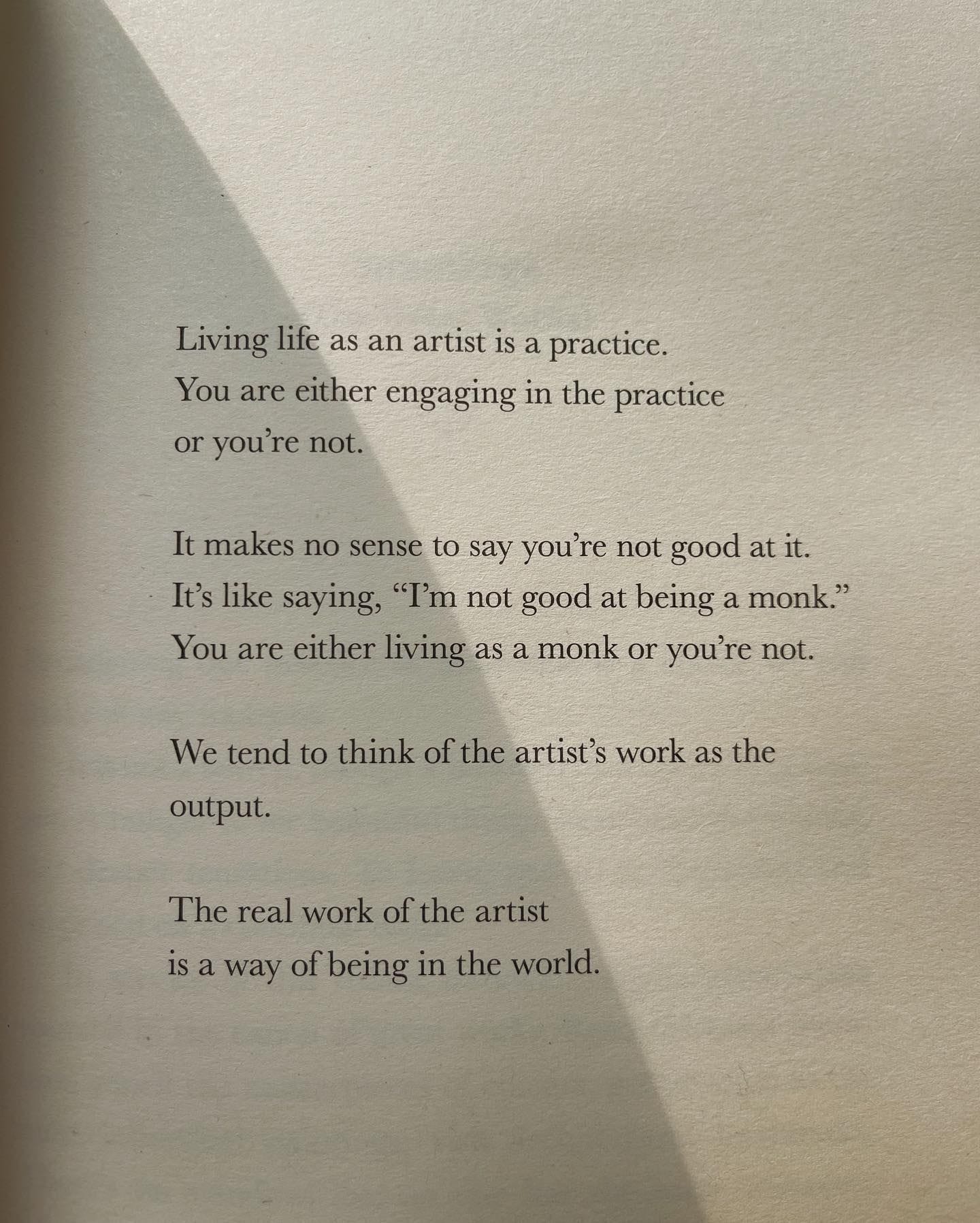 ‘To live as an artist is a way of being in the world. A way of perceiving. A practice of paying attention. Refining our sensitivity to tune in to the more subtle notes. Looking for what draws us in and what pushes us away. Noticing what feeling tones arise and where they lead. Attuned choice by attuned choice, your entire life is a form of self-expression. You exist as a creative being in a creative universe. A singular work of art.’